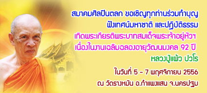 ขอเชิญทุกท่านร่วมทำบุญฟังเทศน์มหาชาติ และปฎิบัติธรรมเทิดพระเกียรติพระบาทสมเด็จพระเจ้าอยู่หัวฯ เนื่องในงานเฉลิมฉลองอายุวัฒนมงคล 92 ปี หลวงปู่แผ้ว ปวโร